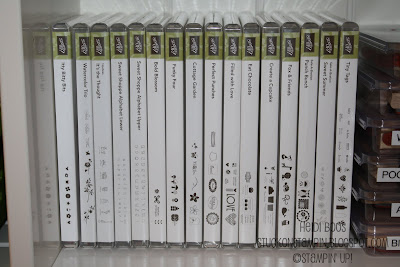 Have you purchased any clear mount stamps yet? Stampin' Up! is well known for their wood stamps, but about a year ago Stampin' Up! introduced clear mount stamp sets into their list of products. There are many advantages to clear mount stamps...one of them being their sleek and compact storage. The case size is the same as a DVD case. You'll notice how these fit on the shelves compared to the wood mount stamp sets. Now you can have room for double the stamp sets! (*wink*)